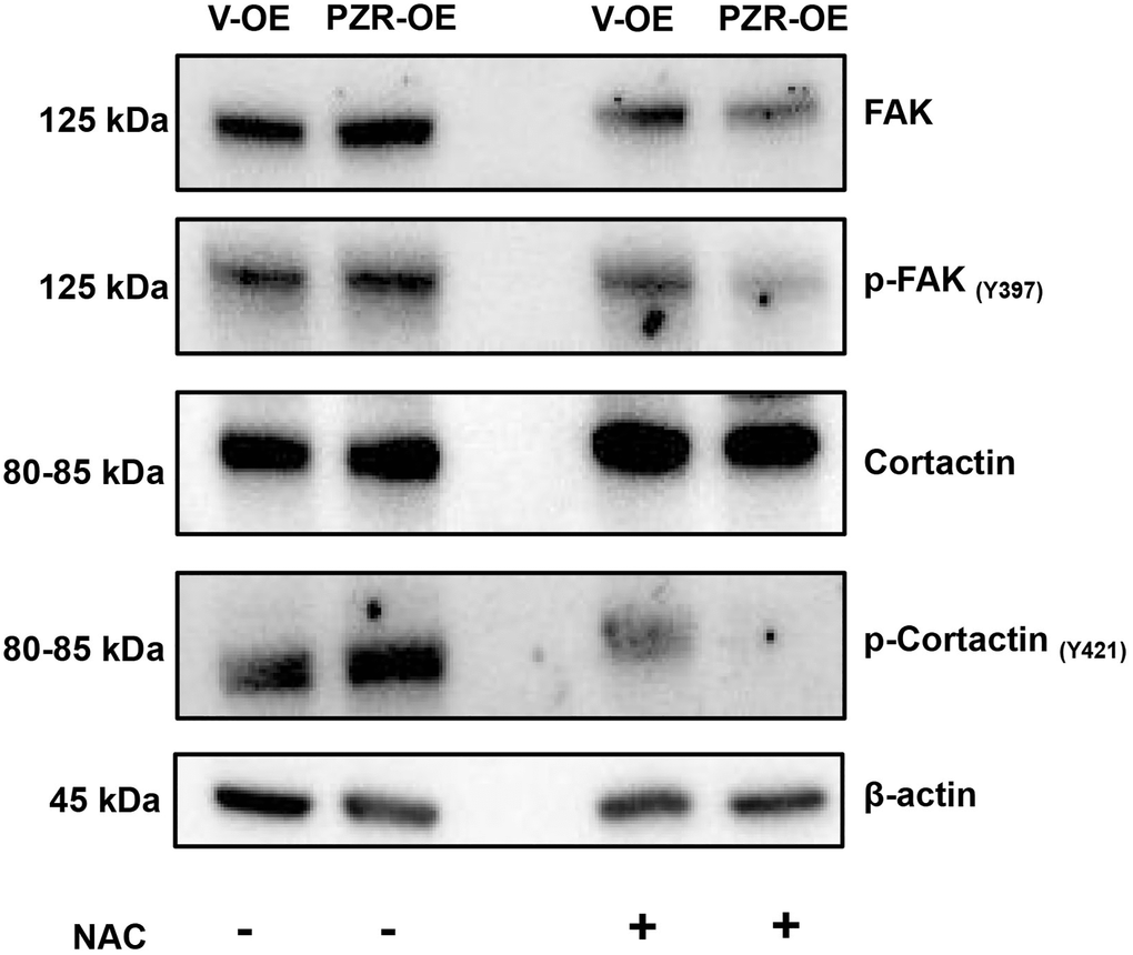 N-Acetyl-Cysteine (NAC), a membrane-permeable cysteine precursor, is used as a ROS scavenger and a potent antioxidant. Cells were treated with NAC (100 μM) for 1 h. The Figure 8 shows that after treatment with NAC, tyrosine phosphorylation of FAK and cortactin decreased in PZR-OE cells.