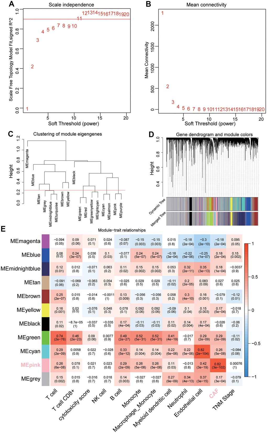 Through data preprocessing, a total of 16, 306 genes with large fluctuation (SD > 0.8) and 425 out of 477 patients were selected for further analysis. The fraction of intratumoral immune/stromal cells were quantified using the MCPcounter algorithm. Using Pearson’s correlation coefficient, we performed a co-expression analysis between the above candidate genes and infiltration of the immune/stromal cells. The threshold soft power was calculated, and value 5 was regarded as the optimal value to construct the hierarchical clustering tree (Figure 1A, 1B). A total of 17 modules were merged into 11 modules based on the module-separating threshold of 0.25 (Figure 1C, 1D). Finally, we chose the pink module (closely related to CAFs) containing 580 genes for the subsequent predictive model construction due to the highest correlation coefficient (R = 0.82, P <0.001) with CAFs (Figure 1E).