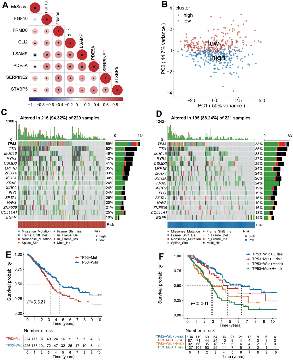 The top 15 genes with high mutation rates (TP53, TTN, MUC16, RYR2, CSMD3, LRP1B, ZFHX4, USH2A, KRAS, XIRP2, FLG, SPTA1, NAV3, ZNF536, COL11A1) combined with EGFR were displayed as waterfall plots in both the high- and low-risk subgroups. Patients with mutations of these genes accounted for 94.32% and 88.24% in the high- and low-risk subgroups, respectively. Of note, the mutation rate of TP53 was 59% and 38% in the high- and low-risk subgroups, respectively, whereas the mutation rate of EGFR was 10% and 15% in the high- and low-risk subgroups, respectively (Figure 3C, 3D). As illustrated by the Kaplan–Meier curves, patients with a TP53 mutation had a shorter OS than those with the TP53 wild type (Figure 3E). Moreover, a combination of the risk score and TP53 mutation status could improve the predictive performance for OS because patients with the TP53 mutation type and high-risk scores had the worst outcome, while patients with the TP53 wild type and low-risk scores had a survival advantage (Figure 3F).