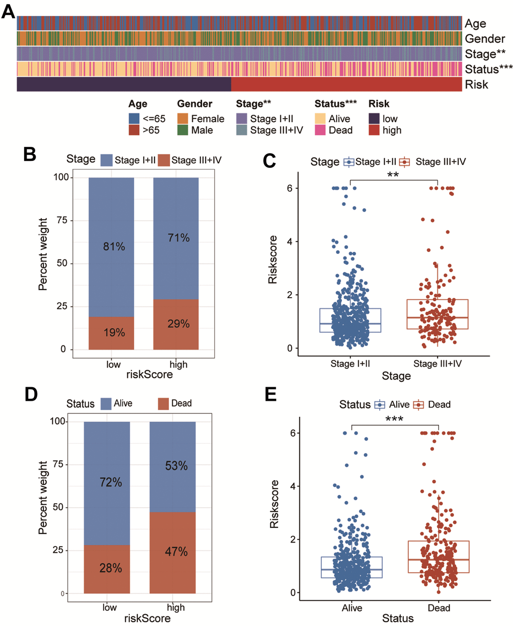 As illustrated in Figure 4A, the high- and low-risk clustering was remarkably associated with the pathologic TNM stage and survival status. In particular, the proportion of patients with stage III+IV was higher. in the high-risk group than that in the low-risk group, while the reverse was true for patients with stage I+II Patients with stage III+IV had a remarkably higher riskscore than those with stage I+II (P<0.01, Figure 4B, 4C). Similarly, the proportion of patients dead was higher in the high-risk group than that in the low-risk group, while the reverse was true for patients alive. Patients dead had a remarkably higher riskscore than those alive (P<0.001, Figure 4D, 4E).