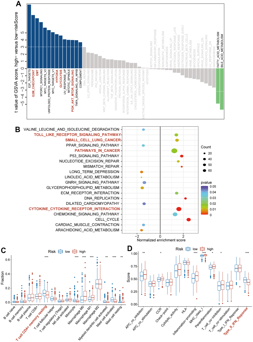 We quantified the proportion of intratumoral immune cells using the CIBERSORT algorithm and scored the immune functions using the ssGSEA method. Based on the matrix of immune cells and immune functions, the differential analysis between the high- and low-risk subgroups was performed using the Wilcox.test, and the results were presented as bar plots. As shown in Figure 5C, 5D, the high-risk subgroup was characterized by decreased infiltration of the CD4+ T cell memory resting and enrichment score of type II IFN response (P < 0.001), which indicated an immunosuppressive TME.