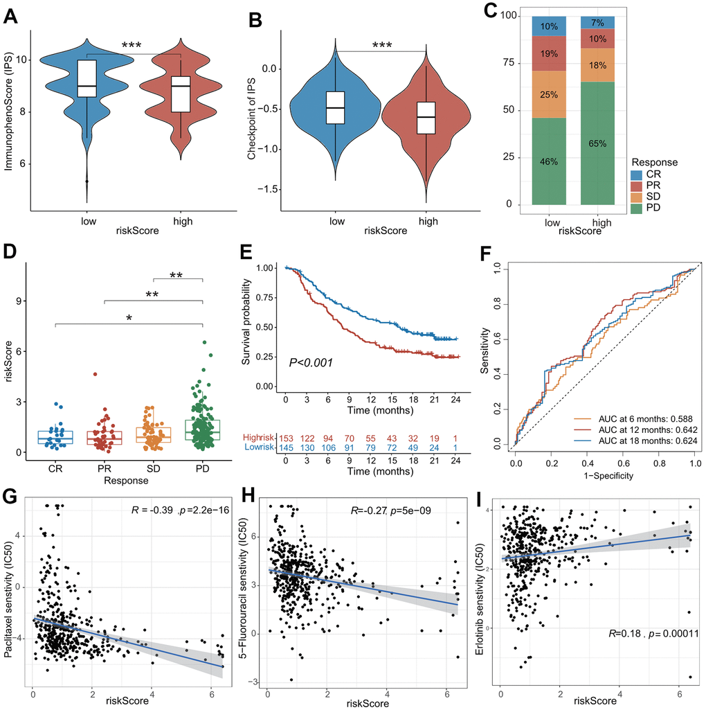 We investigated the differences between the IC50 values for common drugs between the low- and high-risk subgroups. As shown in Figure 6G–6I, the CAFRS score was markedly negatively associated with the IC50 values for paclitaxel and 5-fluorouracil (common chemotherapeutic agents) and positively associated with the IC50 values for erlotinib (common EGFR tyrosine kinase inhibitor [TKI]). Moreover, the low-risk subgroup presented remarkably higher IC50 values for paclitaxel and 5-fluorouraci but had lower IC50 values for erlotinib (Supplementary Figure 2D–2F). This indicated that LUAD patients with low-risk scores were more sensitive to erlotinib therapy but benefited little from conventional chemotherapy, which is likely due to drug resistance. In summary, CAFRS could predict anticancer drug responses in patients with LUAD.