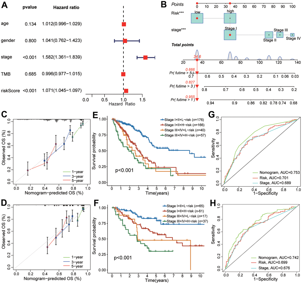 The univariate and multivariable Cox regression analyses indicated that the CAFRS and TNM stages were independent prognostic factors for LUAD (Figure 7A). To explore a more accurate and reliable prediction tool, we established a nomogram to predict the survival probability of 1-, 3- and 5-year OS for LUAD (Figure 7B). During the 1-, 3- and 5-year OS, the calibration curves of the nomogram exhibited excellent concordance with the actual survival rate in two independent cohorts (TCGA-LUAD, GSE41271) (Figure 7C, 7D). The 5-year survival rate of stages I+II and the low-risk subgroup in the TCGA and GEO cohorts was up to 58.8% and 82.9%. However, the number of stages III+IV and the high-risk subgroup decreased, reaching 30% and 21.3%, respectively (Figure 7E, 7F). Moreover, compared with the single TNM stage or CRAFS, the merged nomogram had a better predictive performance in OS. The 5-year AUC value of the nomogram reached 0.742 and 0.702 in the TCGA and GEO cohorts, respectively, which is greater than that of the TNM stage and CAFRS (Figure 7G, 7H).