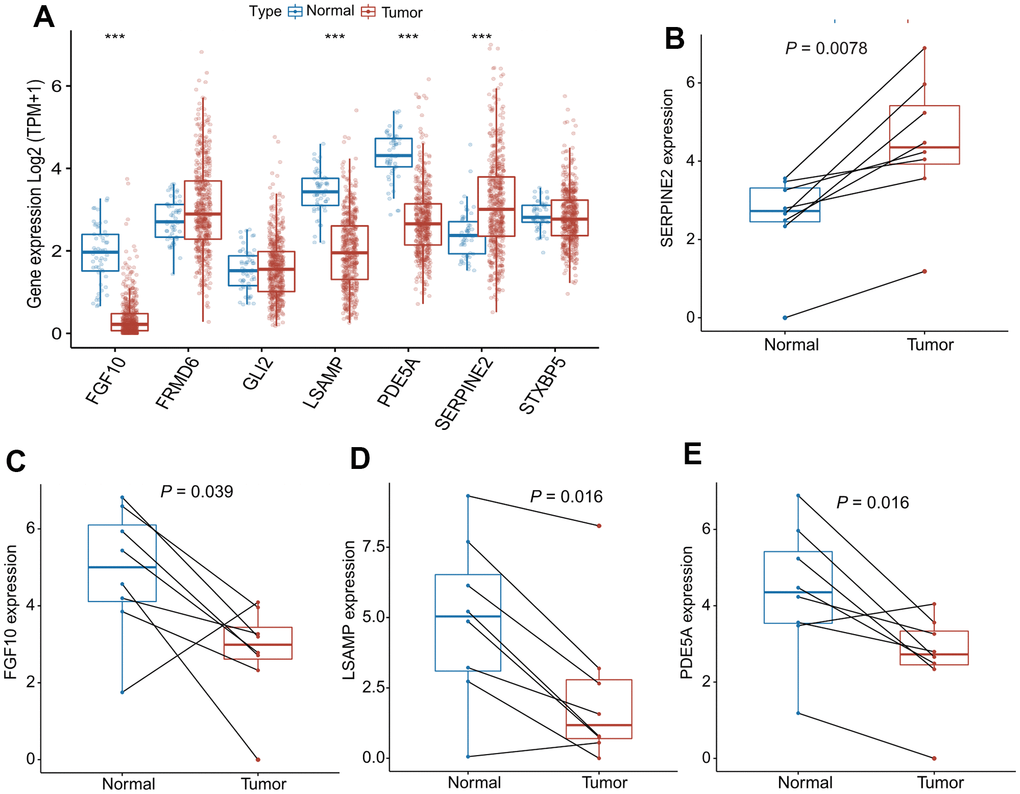 As shown in Figure 8A, four out of seven genes in the CAFRS were differentially expressed between the cancer and paratumor tissues from LUAD patients in TCGA. To prove the reliability of the CAFRS, the mRNA levels of these four genes were detected using a qRT-PCR. Consistent with the transcriptome data, SERPINE2 was more highly expressed in lung cancer tissues compared with that in paratumor tissues, while a low expression of FGF10, LSAMP, and PDE5A was found in lung cancer tissue (Figure 8B–8E).