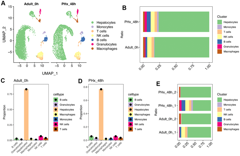 Single cell RNA-sequencing analysis of liver regeneration at 48h after partial hepatectomy (PHx)