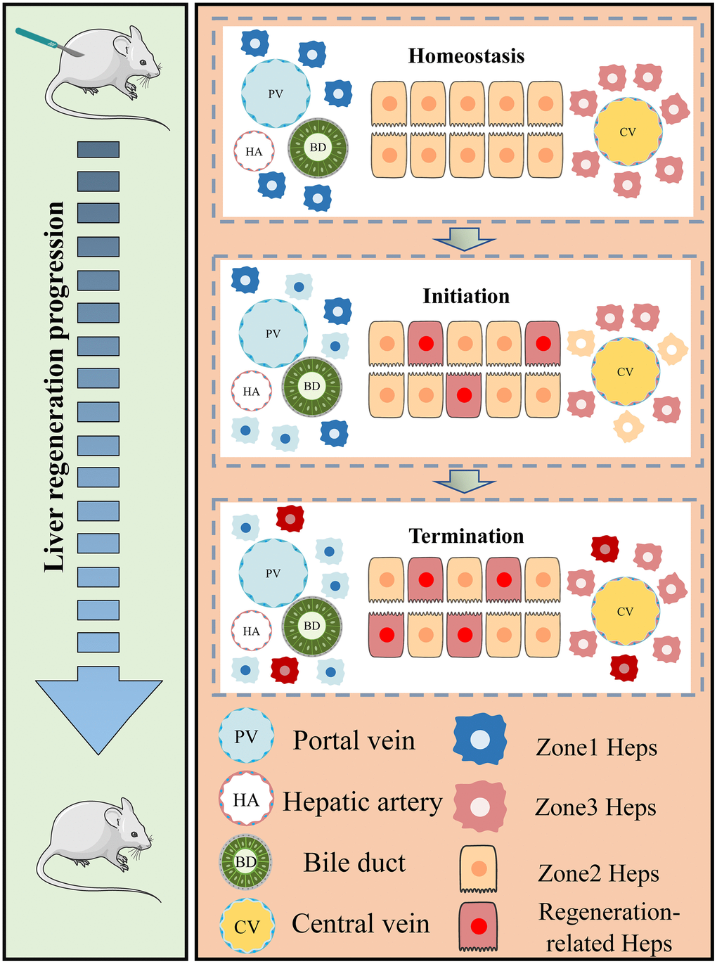 The liver is a multifunctional internal organ closely related to human health and performs several vital physiological functions, such as decomposition of blood toxins, metabolic storage, lipid/glucose metabolism, secretion of serum proteins [1]. Hepatocytes, as the primary cell type within the liver, are responsible for these crucial functions. Previous single-cell transcriptome studies have carefully drawn the molecular atlas of adult liver cells [2], however, effective systematic integration of single-cell transcriptome studies on hepatocytes are urgently needed during liver regeneration [3]. Taken together, In-depth understanding of the specific mechanisms and state changes of hepatocytes during regeneration deepen our understanding of liver disease, opening up novel strategies for patients across the spectrum of liver diseases.