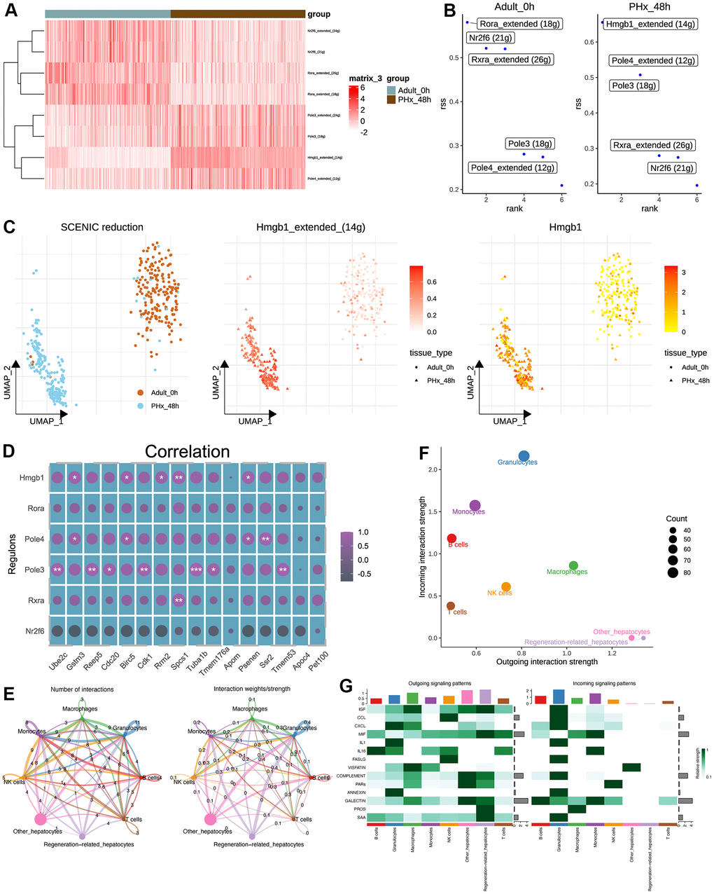 The good performance of the constructed regeneration model indicates the gene expression varied largely during PHx. Therefore, we adopted SCENIC pipeline [21] for further uncovering the differences of transcriptional factors. As a result, several TFs were found out (Figure 5A). According to the calculated Regulon Specificity Score (RSS), The top TFs were different from the two groups, including Hmgb1, Rora, Pole4, Pole3, Rxra and Nr2f6 (Figure 5B). According to the inferred TFs, we further performed the reduction analysis and result implied the different distribution of regeneration-related hepatocytes and other hepatocytes from PHx_0h and PHx_48h groups (Figure 5C). And the mRNA expression level and inferred activity score of Hmgb1 were both higher in regeneration-related hepatocytes rather than other hepatocytes (Figure 5C). Therefore, we inferred our that Hmgb1 might be vital in the regeneration-related hepatocytes of PHx_48h group. Then, we performed the correlation analysis of the inferred TFs and 17 regeneration-related genes. Results showed that Hmgb1 and Pole3 had significant correlated with various gens (Figure 5D).