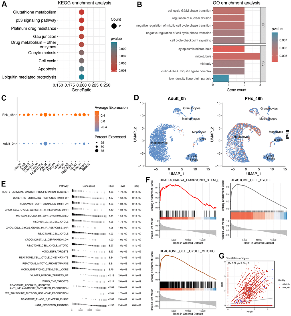 Subsequently, we conducted the GO and KEGG analyses of the 17 genes (Figure 7A, 7B). Notably, the proliferation-related pathways, including “p53 signaling pathway”, “Cell cycle” and “Regulation of nuclear division” were highly enriched. Then, we explored the average expression level of the 17 genes from single cell data (Figure 7C), especially Birc5 (Figure 7D). Then, GSE167034 dataset was used to run the GSEA analysis of Birc5, which could be used to better understand the potential function of Birc5. Interestingly, result showed that Birc5 had been highly correlated with the “Reactome_cell_cycle” pathway and stem cell-related pathways, consistent with the enrichment analysis of 17 genes (Figure 7E, 7F). Finally, we performed the correlation analysis between Birc5 and Transcriptional factor Hmgb1, which also highlighted the expression correlation between them (Figure 7G).