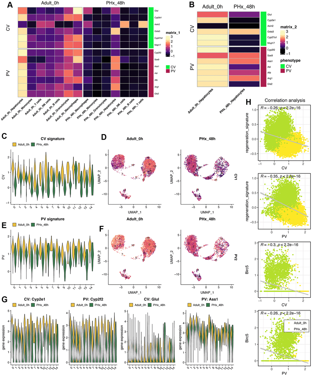 Spatial characteristics of hepatocytes indicates the maturation and biological function of hepatocytes. Herein, we collected the genes/biomarkers related to Portal Vein area (PV) and Central Vein area (CV), including Cyp2e1, Cyp2f2, Glul, Ass1 and so on (Figure 8A). Result indicated that the expression of PV- or CV-related genes will be down-regulated in almost all cell types (Figure 8A), especially hepatocytes (Figure 8B). Then, we utilized the “addmodule” function in Seurat packages to further calculate the overall signatures of PV and CV in all 15 hepatocyte clusters (Figure 8C–8F). Obviously, the PV and CV signature score will decrease when the hepatocytes tried to change its status from quiescent state into proliferative state (Figure 8E, 8F). The landmark genes, including Cyp2e1, Cyp2f2, Glul and Ass1, also supported the results that almost all clusters of hepatocytes lose the spatial characteristics to some extent, no matter PV or CV (Figure 8G). Notably, we also found that the identified regeneration signature and Birc5 were both negatively correlated with both PV and CV signature, respectively (Figure 8H).