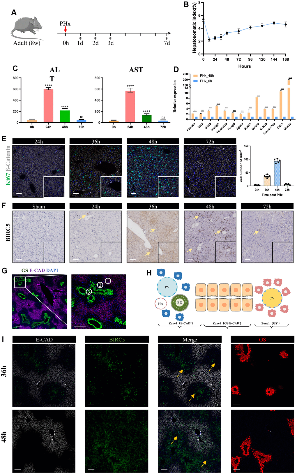 Survivin, also known as Birc5 and as part of the chromosomal complex during mitosis, directs the aggregation and segregation of chromosomes as well as cytoplasmic division [35]. When it occurs at the interphase, it is mainly located in the cytoplasm and participates in the anti-apoptotic function of cells [35]. Another finding suggests that survivin may be regulated by metabolic stress, which is consistent with the significant metabolic changes observed following PHx [36]. This work emphasized that Birc5 can act as a potential marker for estimating hepatocyte entering the peak of proliferation, with a significant negative correlation with metabolic zonation of liver, suggesting that it plays an important role in the process of liver regeneration and disruption of liver zonation.