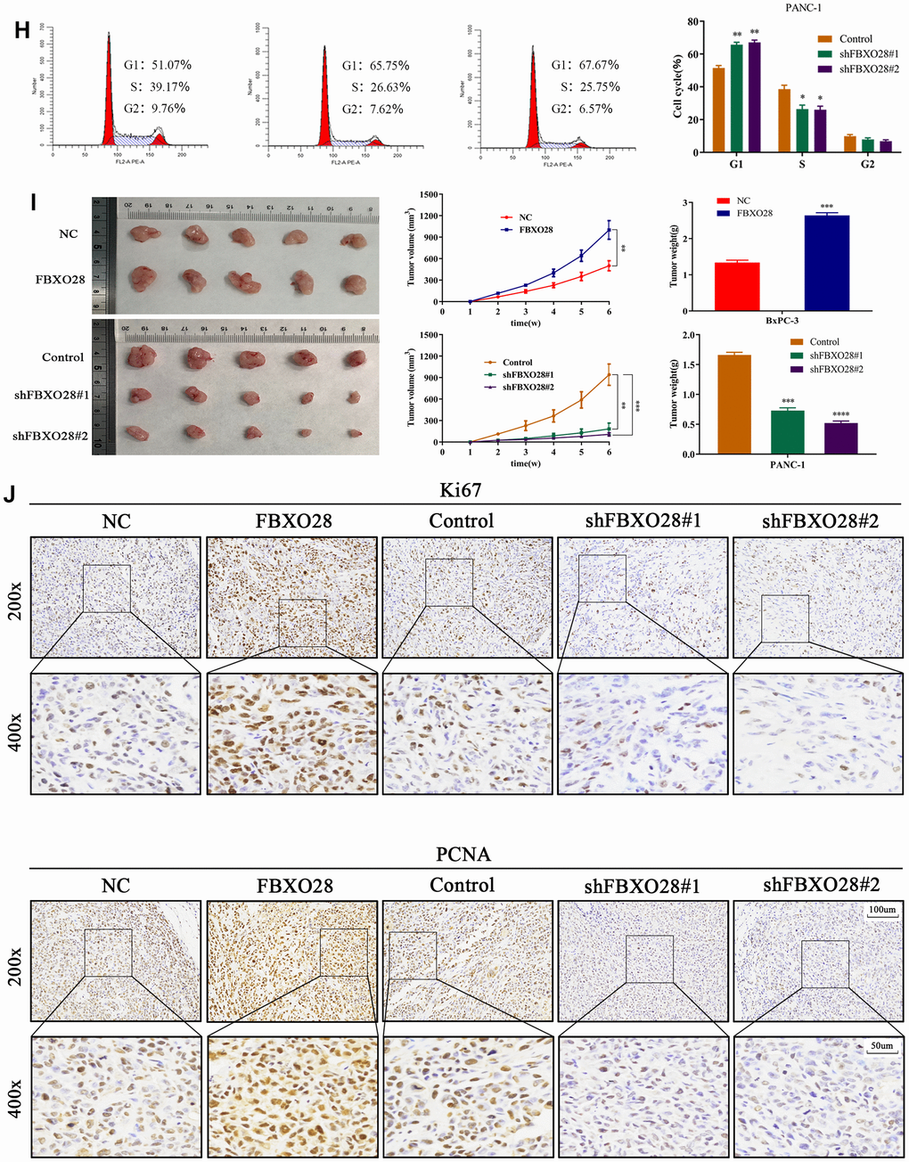 (H) Western blot and flow cytometry to investigate the effect of FBXO28 on the cell cycle. (I) To construct a xenograft model, mice were injected subcutaneously with cells according to grouping, tumor volume was assessed weekly, the mice were euthanized after 6 weeks, and the tumors were resected and weighed. (J) Immunohistochemical (IHC) of mouse tumor tissues showing the protein expression of Ki67 and proliferating cell nuclear antigen (PCNA) (magnification: ×200, ×400). **P < 0.01, ***P < 0.001, ****P < 0.0001.