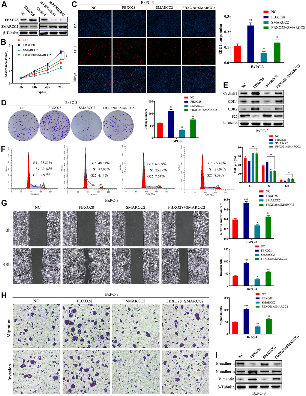 According to the results above, we speculated that FBXO28 may have an impact on PC cell proliferation, invasion, and migration by regulating the expression of SMARCC2. The results showed that protein expression of SMARCC2 was decreased or increased after upregulation or downregulation of FBXO28, respectively (Figure 5A), whereas the expression of SMARCC2 mRNA was not affected by FBXO28 (Supplementary Figure 1). To investigate the roles of SMARCC2 and FBXO28, we constructed an upregulated SMARCC2 plasmid and co-transfected it with overexpressed FBXO28. The results of the CCK-8, EdU, clone plate, cell cycle, and western blot tests showed that upregulation of SMARCC2 reduced the proliferative effect of overexpressed FBXO28 to promote BxPC-3 cells (Figure 5B–5F). The wound healing assay, Transwell assay, and western blotting showed that upregulation of SMARCC2 attenuated the effect of overexpressed FBXO28 on promoting the invasion and migration of BxPC-3 cells (Figure 5G–5I). These findings imply that upregulation of SMARCC2 can reverse the effects of overexpressed FBXO28 in promoting the proliferation, invasion, and migration of PC cells.