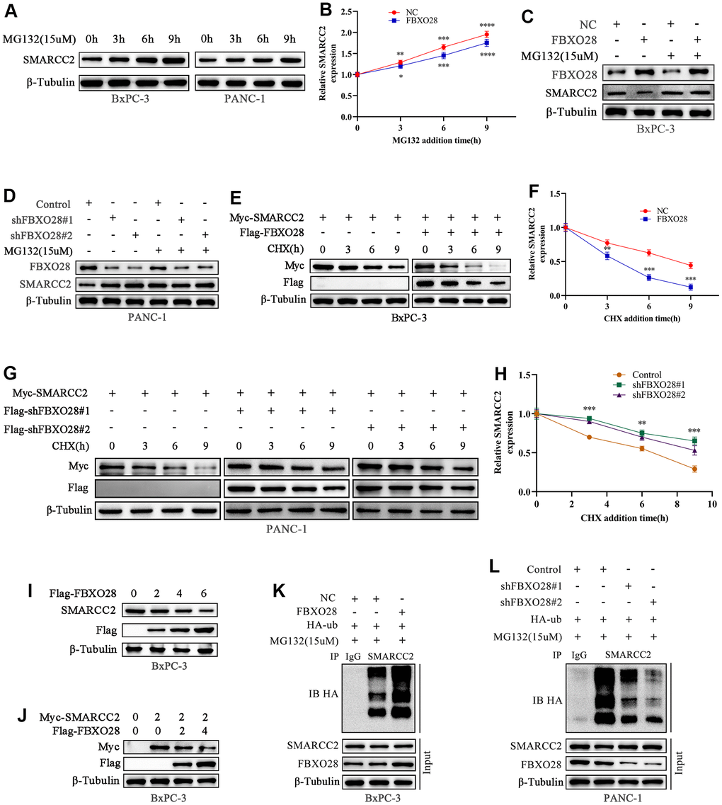 It is unclear whether the ubiquitination ligase FBXO28 regulates SMARCC2 ubiquitination. We treated BxPC-3 and PANC-1 cells with the proteasome inhibitor MG132 which resulted in an incremental increase in endogenous SMARCC2 protein expression, suggesting that the SMARCC2 protein undergoes UPS degradation (Figure 6A, 6B). The addition of MG132 to overexpressed BxPC-3 cells and downregulated PANC-1 cells showed that neither up- nor downregulation of FBXO28 expression significantly affected SMARCC2 protein expression in PC cells (Figure 6C, 6D). Additionally, we added exogenous SMARCC2 plasmids to stably transfected BxPC-3 and PANC-1 cells and treated the cells with CHX at different time points. We found that overexpression of FBXO28 in BxPC-3 cells shortened the half-life of the SMARCC2 protein (Figure 6E, 6F). Conversely, downregulation of FBXO28 in PANC-1 cells prolonged the half-life of the SMARCC2 protein (Figure 6G, 6H). These findings imply that FBXO28 participates in SMARCC2 degradation.