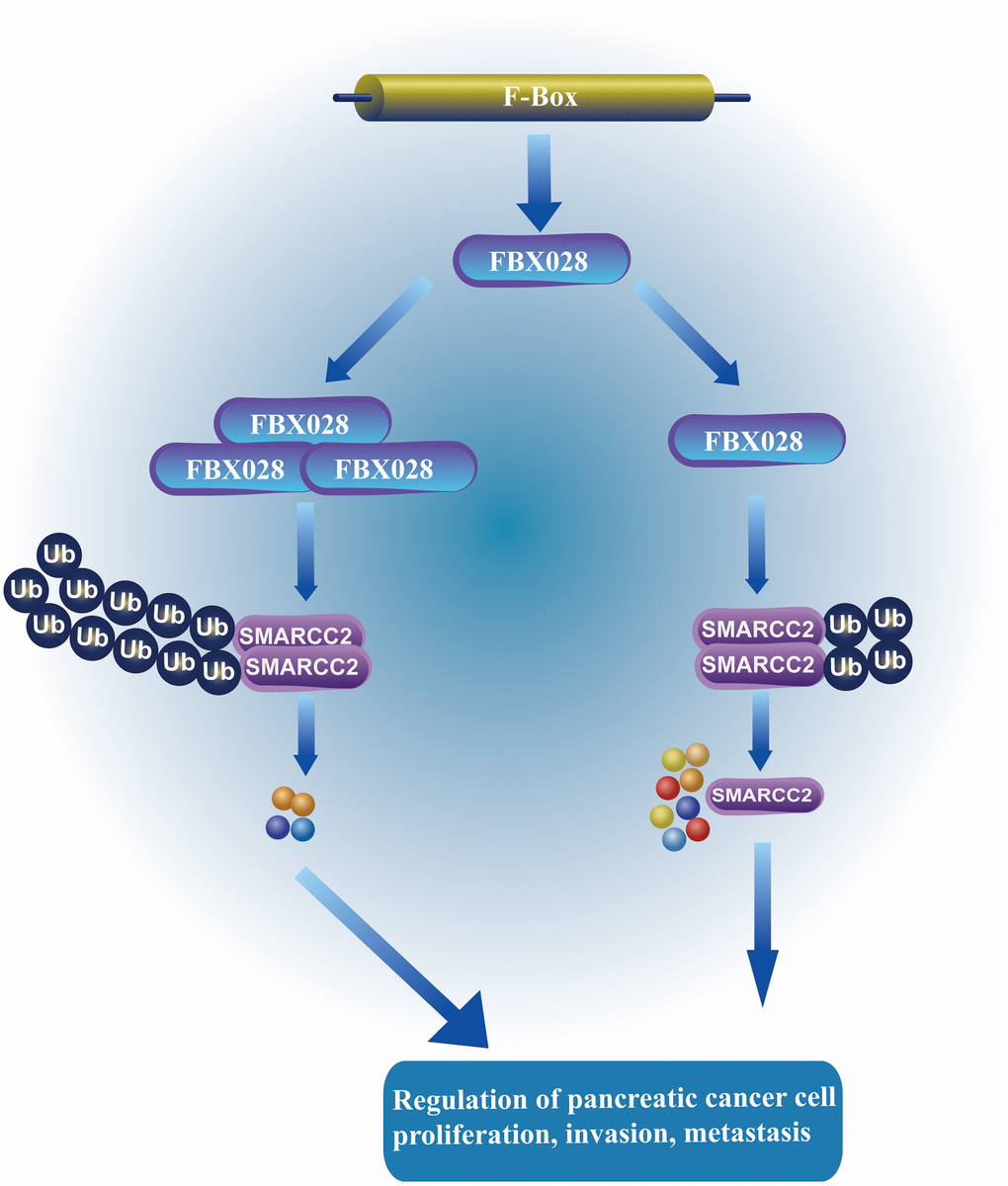 The goal of this study was to assess FBXO28 expression in PC and to explore its biological role. Our results revealed a possible underlying mechanism for FBXO28 in PC, in which it plays an oncogenic role by mediating the ubiquitination of SMARCC2 and promoting the degradation of SMARCC2 in PC cells.