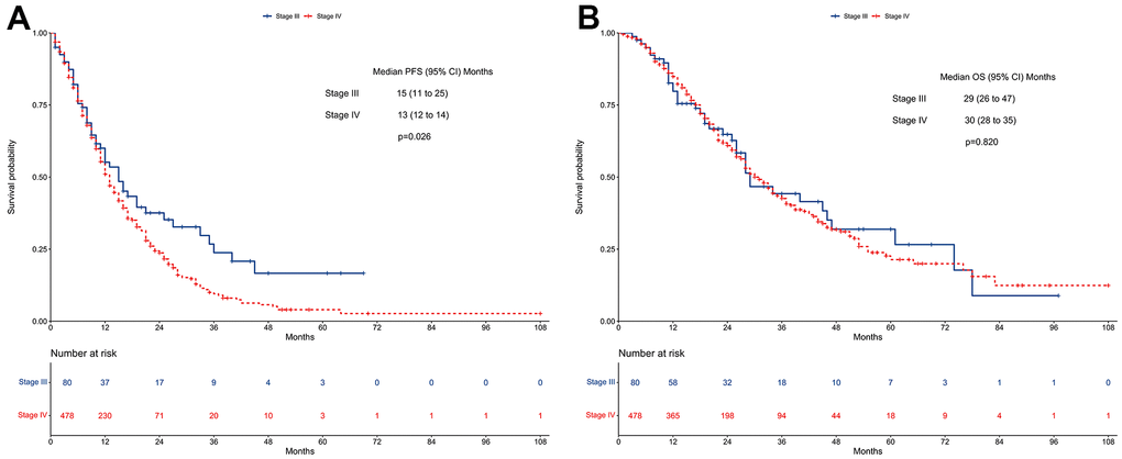 Stage III patients showed a better median PFS than stage IV patients (15 vs. 13 months; P=0.026, Figure 2A). In contrast, the median OS did not differ between stage III cases and stage IV cases (29 vs. 30 months; P=0.820, Figure 2B).