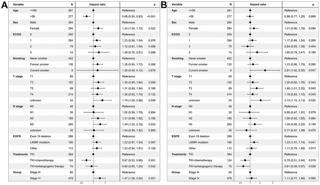 Clinical factors, including age, sex, Eastern Cooperative Oncology Group (ECOG) performance status, smoking status, T stages, N stages, AJCC stages, EGFR subtypes, and treatment patterns (TKI therapy, TKI plus chemotherapy, and TKI plus antiangiogenic therapy) were extracted.