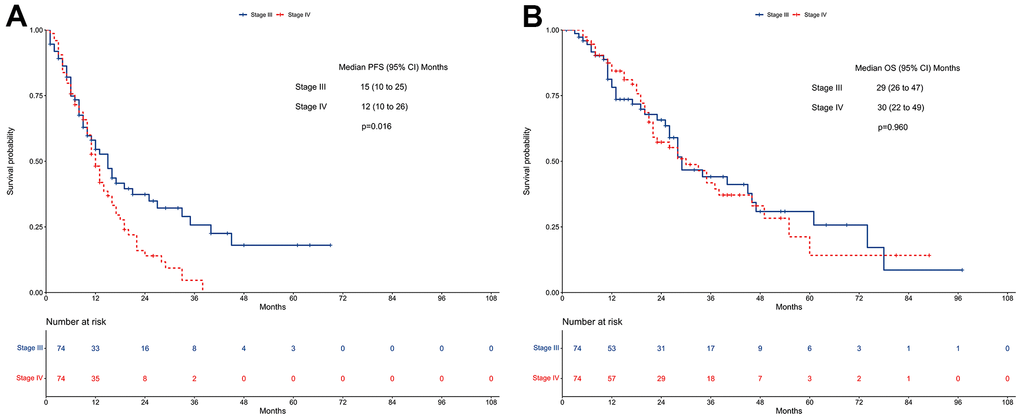 Stage III patients had a better median PFS than stage IV patients (15 vs. 12 months; P=0.016, Figure 4A). In contrast, the median OS did not differ between stage III cases and stage IV cases (29 vs. 30 months; P=0.960, Figure 4B).