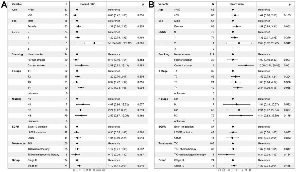 Kaplan-Meier analysis with log-rank test statistics was used to compare median PFS and OS between stage IV and stage III groups. Cox proportional hazards models adjusted for age, sex, smoking status, ECOG performance status, T stages, N stages, treatment patterns, EGFR subtypes, and clinical stages were used to estimate the hazard ratios (HRs) with 95% confidence intervals (CIs) for potential independent prognostic factors.