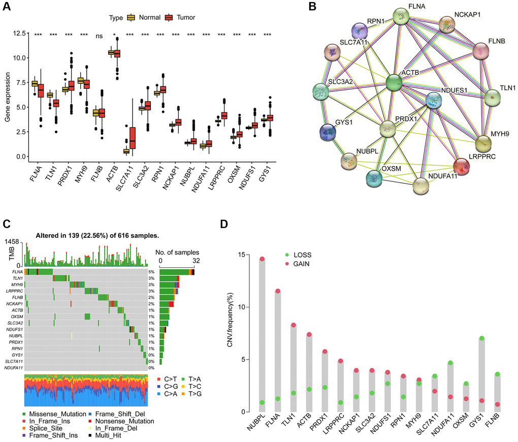 We identified 16 disulfidptosis-associated genes (DAG) and investigated their potential function in the progression of LUAD. Differential expression analysis revealed distinct expression profiles of these genes between normal and tumor tissues (Figure 1A). Specifically, FLNA, TLN1, MYH9, and ACTB were down-regulated in tumor tissues, while PRDX1, SLC7A11, SLC3A2, RPN1, NCKAP1, NUBPL, NDUFA11, LRPPRC, OXSM, NDUFS1, and GYS1 were overexpressed. The PPI network analysis suggested potential interactions among these genes (Figure 1B). Somatic mutation analysis showed that 139 LUAD samples (22.56%) had mutation frequency variation in DAG out of 616 samples, with FLNB, LRPPRC, MYH9, and TLN1 having mutation frequencies of 6%, 3%, 3%, and 3%, respectively (Figure 1C). In addition, the CNV analysis revealed CNV amplification of NUBPL, FLNA, TLN1, ACTB, PRDX1, LRPPRC, NCKAP1, SLC3A2, NDUFS1, and RPN1, while SLC7A11, NDUFA11, OXSM, GYS1, and FLNB showed higher CNV deletion (Figure 1D). These findings indicate a differential landscape of DAG expression profile, mutation, and CNV, suggesting their potential role in the carcinogenesis of LUAD.