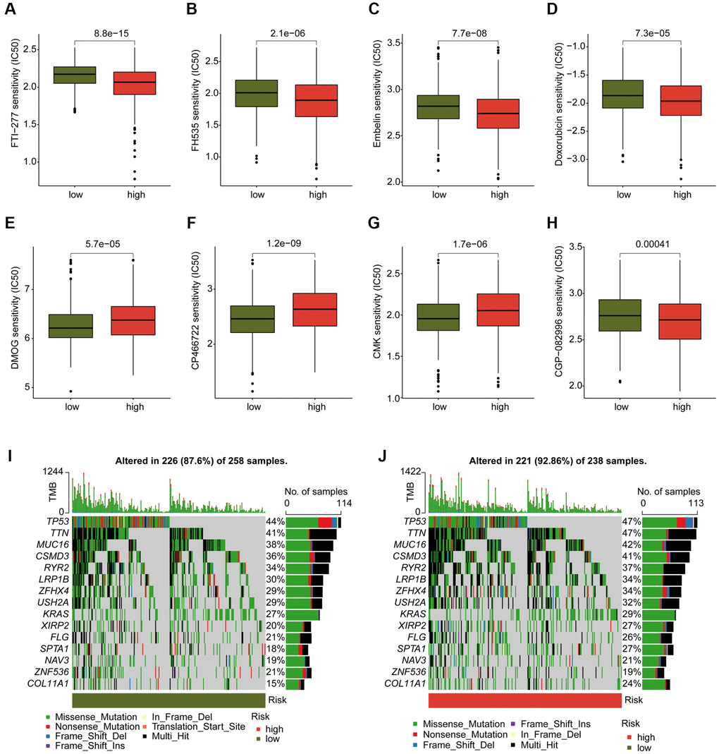 We conducted an evaluation of several chemotherapeutic drugs that may be beneficial for the treatment of LUAD across different DAG score subtypes. As depicted in Figure 10A–10H, we observed that LUAD samples with high DAG score had a lower IC50 value for FTI-277, FH535, Embelin, Doxorubicin, and CGP-082996, while the IC50 value of DMOG, CP466722, and CMK was higher in the DAG score for LUAD. Additionally, we explored the TMB characteristics of LUAD samples in DAG score subtypes. We found that 226 samples (87.6%) of 258 LUAD samples had somatic mutations in the low DAG score group, while 221 samples (92.86%) of 238 LUAD samples had somatic mutations in the high DAG score group (Figure 10I, 10J). Our mutation frequency results suggested that LUAD samples with high DAG score had a higher somatic mutation frequency, including TP53 (47%), TTN (47%), MUC16 (42%), and CSMD3 (41%).
