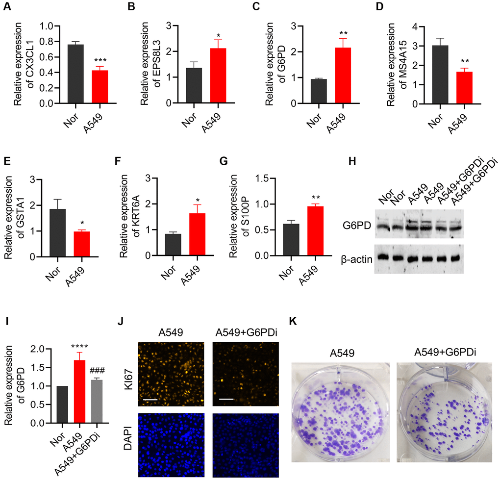 qPCR was utilized to validate the expression of the 7 key genes that were screened in both lung cancer cell line (A549) and normal bronchial epithelial cell line (BEAS-2B). Results indicated a significant downregulation of CX3CL1, MS4A15, and GSTA1 in lung cancer cells, while EPS8L3, G6PD, KRT6A, and S100P were notably upregulated, in line with the bioinformatics analysis findings (Figure 11A–11G). As G6PD showed the highest risk coefficient for lung cancer, the impact of G6PD downregulation on lung cancer cell proliferation and colony formation was investigated. Western Blot analysis exhibited a significant increase in G6PD expression in A549 cells compared to the BEAS-2B group, which was consistent with the qPCR results. Treatment with G6PD inhibitor G6PDi effectively reduced G6PD expression in lung cancer cells (Figure 11H, 11I). Results from Ki67 staining and colony formation assays demonstrated that interfering with G6PD can substantially inhibit the proliferation ability of lung cancer cells (Figure 11J, 11K).
