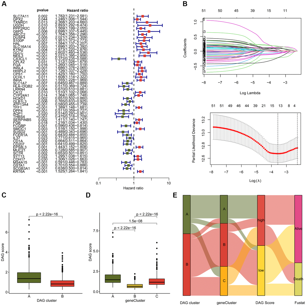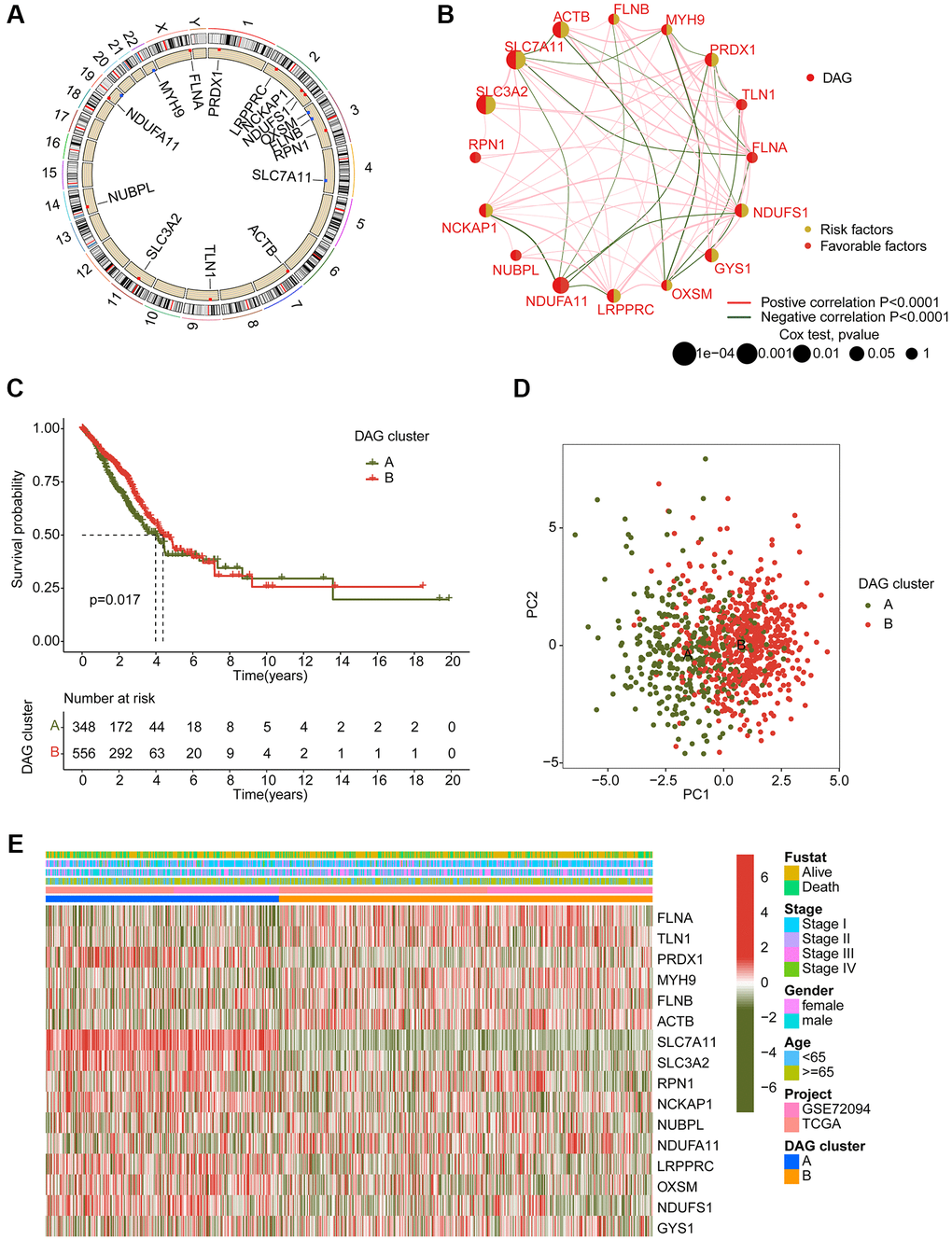In order to determine the DAG-based molecular subtypes of LAUD, we collected 397 LAUD samples from GSE72094 and 507 LAUD samples from the TCGA-LUAD dataset. As depicted in Figure 2A, a circular plot was used to illustrate the location of the 16 DAGs in the chromosome. The network plot was used to demonstrate the relationship and prognostic value of the DAGs in LAUD. 9 prognostic variables were obtained through univariate Cox analysis, including a favorable factor (NDUFA11) and 8 risk factors (NCKAP1, PRDX1, NDUFS1, LRPPRC, GYS1, ACTB, SLC7A11, and SLC3A2) (Figure 2B). Based on the expression profile of the 16 DAGs, two molecular subtypes of LAUD samples were successfully identified using an unsupervised consensus clustering algorithm. Notably, a significant difference in clinical prognosis was observed between the two DAG-based molecular subtypes, with the clinical prognosis of LAUD samples in DAG-cluster A being worse compared to those in DAG-cluster B (p = 0.017, Figure 2C). Furthermore, the principal component analysis (PCA) diagram could clearly differentiate the LAUD samples in DAG-cluster A and B into different distribution patterns, indicating the independence of the DAG-based molecular subtypes (Figure 2D). The heatmap showed the relationship between the expression of the 16 DAGs and clinical variables (survival status, age, gender, and stage) in DAG-cluster A and B. A distinct difference was observed in the expression profiles of the 16 DAGs (Figure 2E).