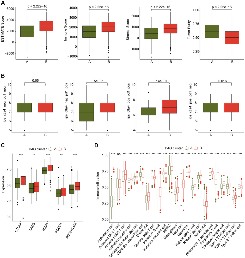 We also conducted an analysis of immune infiltration and immunotherapy response in the DAG-based molecular subtypes of LUAD samples. The results of immune status estimation revealed that LUAD samples with better clinical survival prognosis in DAG-cluster B had higher immune status and lower tumor purity (Figure 3A). Furthermore, the results of immunotherapy response assessment suggested that LUAD samples in DAG-cluster B were more responsive to PD-1 or CTLA-4 treatment strategies (Figure 3B). The immune checkpoint result indicated that the expression of CTLA-4, LAG3, NRP1, PDCD1, and PDCD1LG2 was significantly higher in LUAD samples in DAG-cluster B (Figure 3C). Additionally, the ssGSEA assessment revealed a significantly higher proportion of most immune cells in LUAD samples in DAG-cluster B, indicating a higher immune infiltration status of the samples in DAG-cluster B (Figure 3D). Overall, our findings demonstrate a significant difference in the immune microenvironment between the DAG-based molecular subtypes of LUAD, which is related to the immunotherapy response.