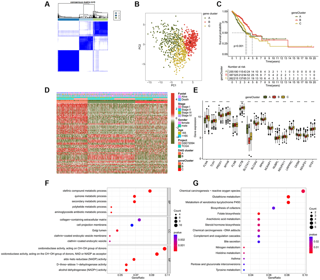 To determine the differentially expressed genes (DEGs) between the subtypes defined by DAG, we employed the “limma” script and applied a P-value (adjusted) threshold of < 0.05 for selection. In order to obtain enriched DEGs, we utilized gene ontology (GO) and Kyoto Encyclopedia of Genes and Genomes (KEGG) assessment algorithms, which were implemented through the “clusterProfiler” script. The DEGs were subsequently used to identify gene-cluster subtypes of LUAD via the “ConsensusClusterPlus” script.
