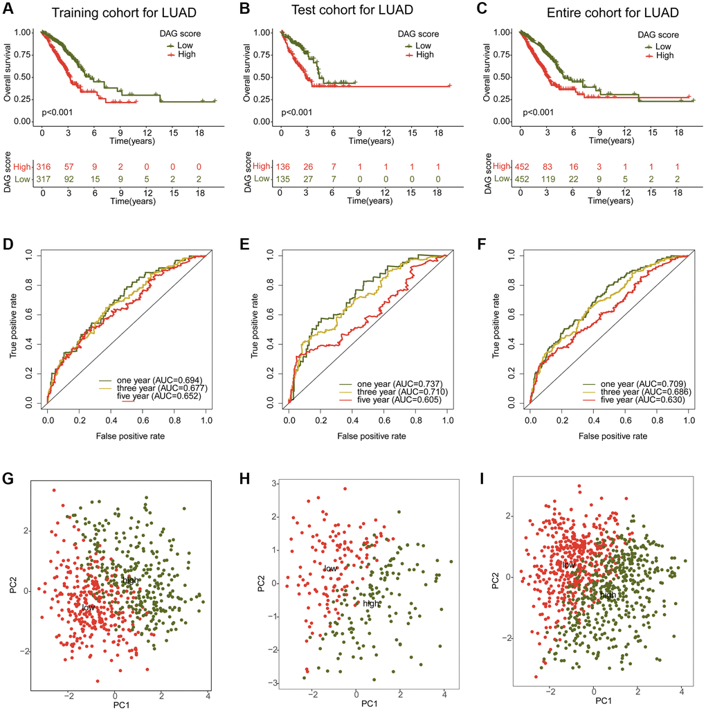 To investigate the potential association between the DAG score and clinical outcome prognosis for LUAD samples, the samples were divided into a training cohort and a test cohort in a 7:3 ratio using the “caret” script. The samples were then categorized as low- or high-DAG score cohorts based on the median DAG score in the training and test cohorts. The clinical outcomes of the LUAD samples in both independent cohorts demonstrated that those with low DAG scores had significantly better prognoses than those with high DAG scores (Figure 6A, 6B). Furthermore, the clinical survival outcomes of the entire cohort revealed that the low DAG score group had a better survival outcome than the high DAG score group (Figure 6C). The AUC of the ROC curve at one, three, and five years was 0.693, 0.677, and 0.652 in the training cohort; 0.737, 0.710, and 0.605 in the test cohort; and 0.709, 0.686, and 0.630 in the entire cohorts (Figure 6D–6F). Additionally, the PCA diagram clearly distinguished the LUAD samples with low and high DAG scores into two distinct distribution patterns in the training, test, and entire cohorts (Figure 6G–6I). These findings demonstrate that the DAG prognostic signature can accurately classify LUAD samples into different risk subtypes and is associated with clinical survival outcomes.