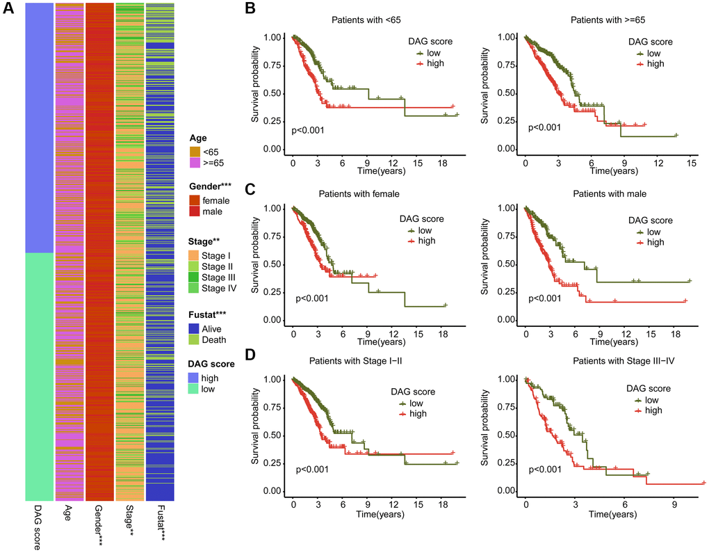 We further examined the role of DAG score in relation to various clinical clinicopathological characteristics. As shown in Figure 7A, a significant difference in DAG score was observed in relation to gender, stage, and clinical survival status. Subsequently, we evaluated the prognostic value of DAG score in different clinical variables, and found that the survival outcome of LUAD samples with high DAG score was worse compared to those samples with low DAG score among different age, gender, and stage groups (Figure 7B–7D).