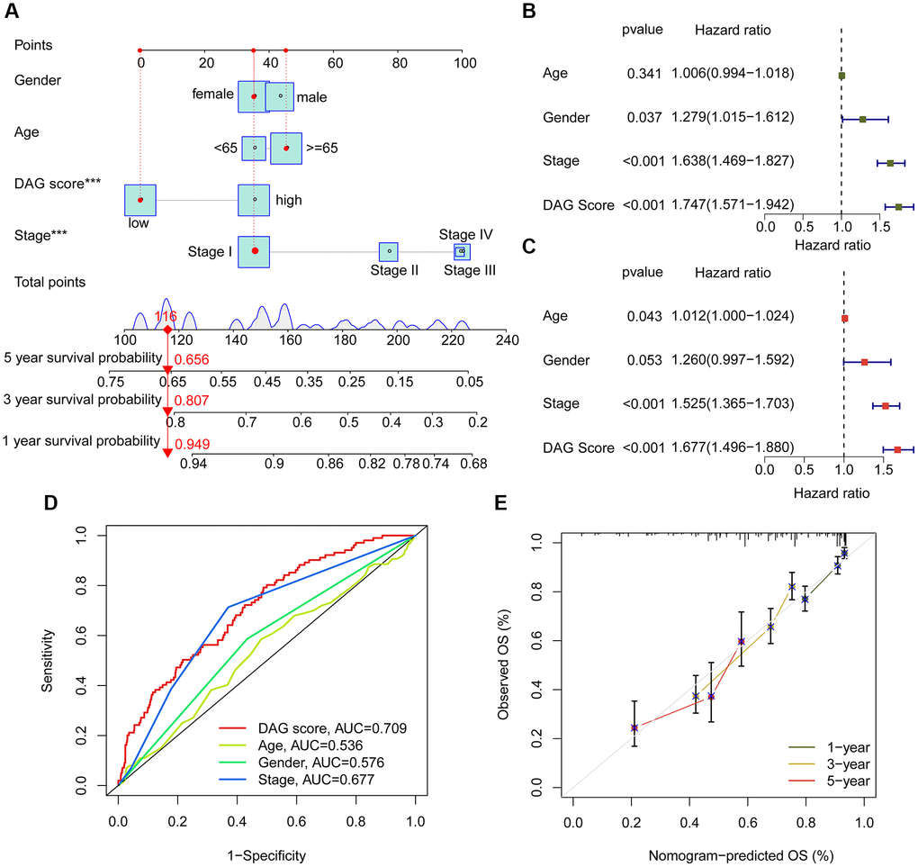 Using integrated clinical information from the TCGA-LUAD and GSE72094 datasets, we developed a nomogram to explore the one, three, and five-year survival ability of LUAD samples based on DAG score and clinical variables (Figure 8A). Univariate Cox analysis revealed that gender (HR = 1.279, 95% CI = 1.015–1.612, P = 0.037), stage (HR = 1.638, 95% CI = 1.469–1.827, P < 0.001), and DAG score (HR = 1.747, 95% CI = 1.571–1.942, P < 0.001) were considered as risk factors for LUAD (Figure 8B). Multivariate Cox analysis showed that stage (HR = 1.525, 95% CI = 1.365–1.703, P < 0.001) and DAG score (HR = 1.677, 95% CI = 1.496–1.880, P < 0.001) were independent prognostic predictors for LUAD (Figure 8C). The ROC curve displayed that the area under the curve (AUC) of DAG score, age, gender, and stage was 0.709, 0.536, 0.576, and 0.677, respectively, suggesting a favorable diagnostic ability of DAG score for LUAD (Figure 8D). Moreover, the calibration curve of one, three, and five-year showed optimal consistency between actual survival probability and nomogram-predicted survival probability (Figure 8E).