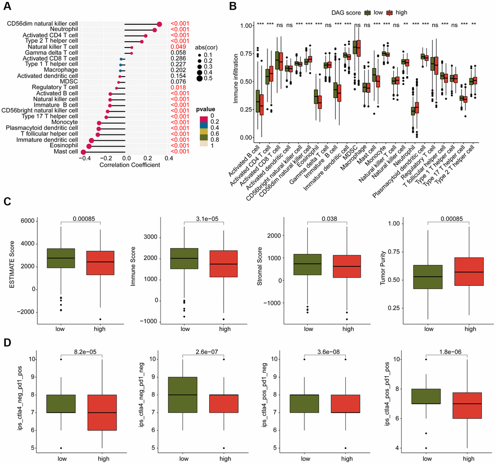 We conducted an investigation into the relationship between DAG score and immune infiltration. As shown in Figure 9A, we observed a significant correlation between DAG score and immune infiltration. Specifically, the DAG score was positively associated with CD56dim natural killer cells, neutrophils, CD4+ T cells, and type 2 T helper cells, while it was negatively associated with mast cells, eosinophils, immature dendritic cells, T follicular helper cells, and plasmacytoid dendritic cells. Our analysis of ssGSEA results revealed that the proportion of most immune cells was lower in the high DAG score group than in the low DAG score group, indicating an immunosuppressed status of LUAD samples with high DAG score (Figure 9B). Additionally, based on the ESTIMATE algorithm, the high DAG score group had lower scores for ESTIMATE, immune and stromal components, and higher tumor purity (Figure 9C). Furthermore, we evaluated the immunotherapy response of LUAD samples in different DAG score subtypes using the TCIA database, and found that the samples with low DAG score were more responsive to the PD-1 and CTLA-4 treatment strategies (Figure 9D). These findings suggest a potential association between DAG score and immune infiltration, and highlight the possibility of predicting immunotherapy response based on DAG score subtypes in LUAD.
