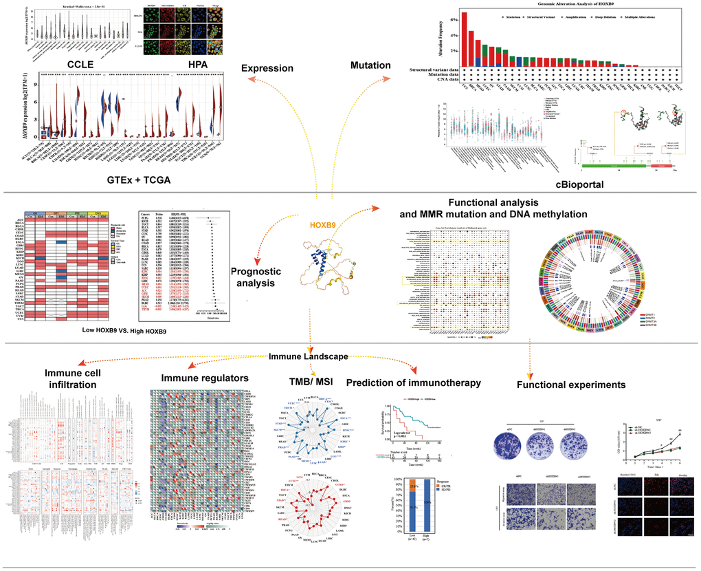 To summarize, HOXB9 has been extensively studied in relation to cancer progression and is considered a crucial player in this process. However, its impact on cancer immune infiltration and prediction of immunotherapy response remains unclear, and there has been no comprehensive investigation of its role across different types of cancer. The first step of our study involved analyzing multiple databases to investigate the expression levels and clinical significance of HOXB9 in 33 different types of cancer. We reveal the association of HOXB9 with evaluation indicators of pan-cancer, such as immune infiltration, immune checkpoint genes (ICGs), TMB, MSI, MMR, and DNA methylation in pan-cancer. Furthermore, HOXB9 was confirmed to be a potent oncogene in glioma cell line experiment. Overall, our findings confirmed that HOXB9 is a robust prognostic biomarker for various types of cancer and can effectively predict the response to immunotherapy. These results serve as a foundation for further exploration into the role of HOXB9 in cancer immunity. Thus, this study represents the first attempt to comprehensively elucidate the tumorigenic role of HOXB9 across various types of cancer, and it offers valuable insights that can guide future research on HOXB9. These findings hold promise for advancing our understanding of HOXB9’s impact on cancer development and progression and may inform the development of novel therapeutic strategies targeting this gene.