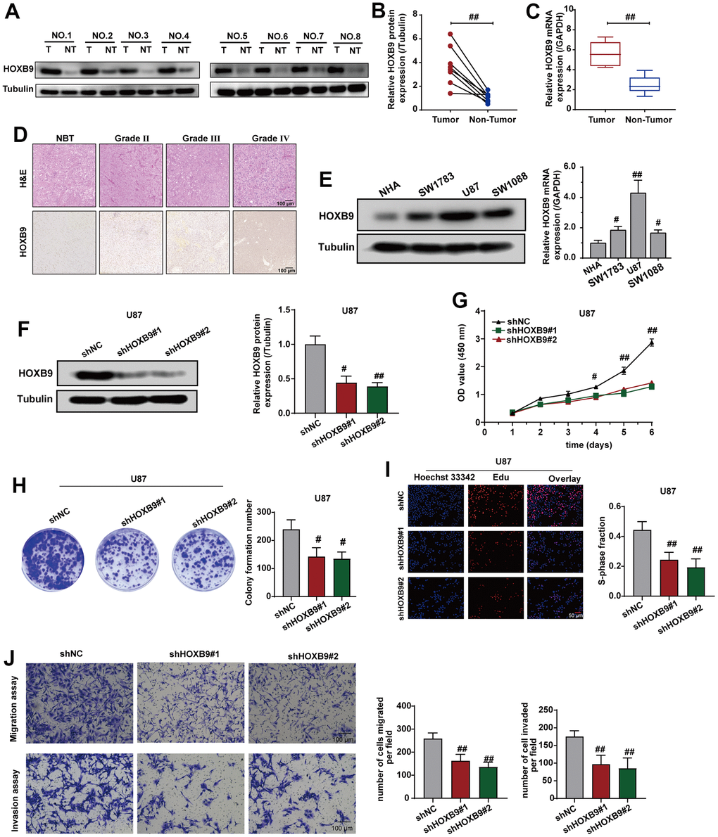 To validate the protein expression levels of HOXB9 in clinical samples of GBM in comparison to adjacent tissues, we conducted additional experiments using western blotting and qRT-PCR analyses. Figure 10A–10C suggested that the protein and mRNA of HOXB9 were upregulated in GBM samples, consistent with IHC results (Figure 10D). Next, we found that HOXB9 expressions were increased in glioma cell lines (SW1783, U87, and SW1088) compared with normal human astrocytes (NHA) (Figure 10E). Therefore, we downregulated the expression of HOXB9 in U87 cells. Western blotting and qPCR results verified the knockdown status of HOXB9 in U87 cell lines (Figure 10F).