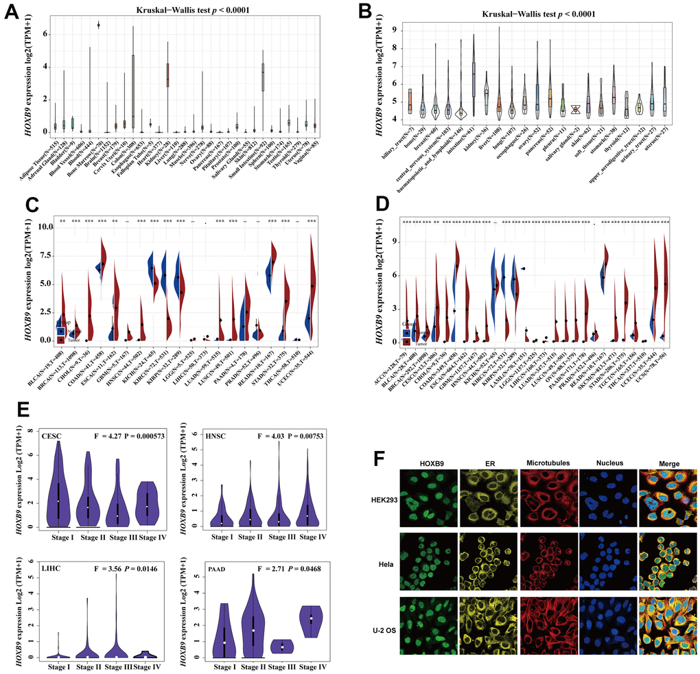 To fully understand the expression patterns of HOXB9, we collected multiple different public datasets, including the TCGA [27], CCLE [28], and GTEx databases [29]. We obtained HOXB9 expression data from the GTEx program for 31 normal tissues and from the CCLE database for 21 tumor cell lines. We retrieved data on HOXB9 expression levels in both cancer and normal tissues from the TCGA pan-cancer cohort and GTEx datasets via the UCSC Xena database. Additionally, the relationship between HOXB9 expression and different pathological stages (stage I-IV) of TCGA tumors via the GEPIA2 website (http://gepia2.cancer-pku.cn/#analysis). Also, the mutation levels of MMR genes and DNA methyltransferases of different types were analyzed from the TCGA database. Pearson correlation analysis was used to further evaluate the associations between HOXB9 and methyltransferases. Immunofluorescence data of HOXB9 in different cells were obtained from the THPA database (https://www.proteinatlas.org/). The abbreviations of cancers were represented in Supplementary Table 1.