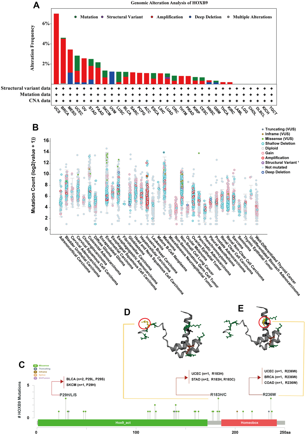 We next analyzed the genetic alterations features of HOXB9 genes. HOXB9 genomic alteration analysis showed that alterations were widespread across multiple cancer types, and a total of 38 mutations were displayed in Supplementary Table 4. As shown in the Figure 3A, HOXB9 mutation frequencies were high in UCS, BRCA, MESO, UCEC, OV, STAD, and PAAD. Moreover, the cancer type with the highest frequency of HOXB9 alterations was UCS, exceeding 6% of UCS patients, and amplification. In addition, amplification is the primary type of HOXB9 variation in UCS, BRCA, OV, PAAD, SARC, PCPG, ACC, LIHC, THYM, PRAD, THCA, and KIRC. However, it is worth noting that the structural variant of HOXB9 was only present in LUAD patients. The mutation count of HOXB9 in various cancers was shown in Figure 3B. The types, sites, and cases of HOXB9 genetic mutation were demonstrated in the Figure 3C. In addition, the primary type of genetic alteration we found in HOXB9 was missense mutation, and P29H/L/S, R183H/C, and R236W alteration were detected in BLCA, SKCM, UCEC, STAD, BRCA, and COAD patients. We further display the 3D structure of HOXB9 of two-mutation sites with the highest alteration frequencies (R183H/C and R236W) (Figure 3D, 3E).