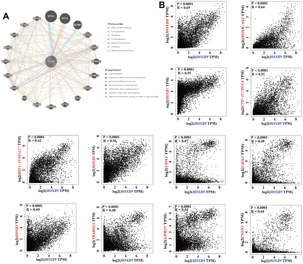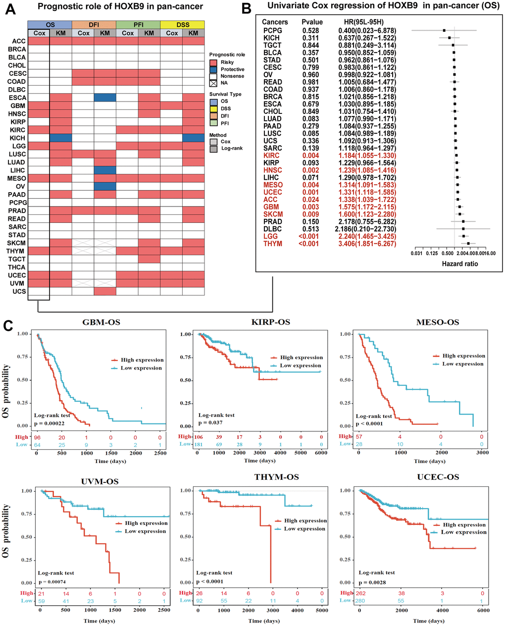 Subsequently, an investigation was conducted to analyze the correlation between HOXB9 and the prognosis of cancer patients. Our findings revealed a strong and consistent correlation between HOXB9 expression levels and cancer patient prognosis across multiple analyses, including OS, DSS, DFI, and PFI. Specifically, elevated HOXB9 expression was identified as a significant risk factor for a considerable proportion of cancer types. These results support prior observations that high HOXB9 expression is associated with poor prognosis in numerous cancers. Furthermore, high expression of transcriptional factor HOXB9 predicts poor prognosis in patients with lung adenocarcinoma [14]. Overall, these results suggest that HOXB9 could serve as an important predictor of cancer patient prognosis.