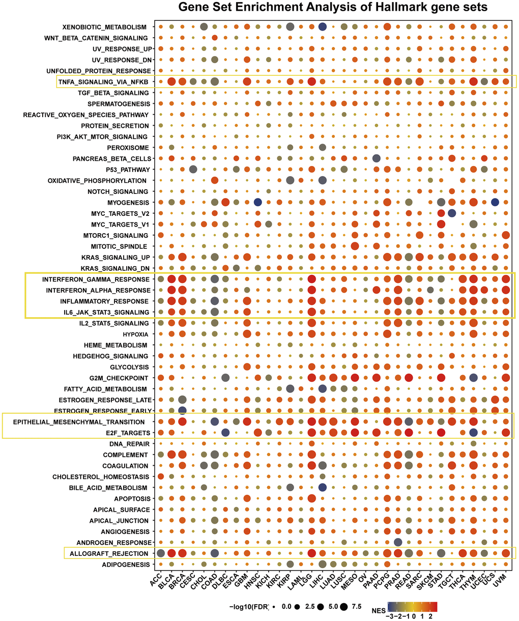 We downloaded the “gmt” file for the hallmark gene set from the Molecular Signatures Database website (https://www.gsea-msigdb.org/gsea/index.jsp). This file contains 50 different gene sets associated with hallmark biological processes. To identify differentially expressed genes between the low- and high-HOXB9 levels cancer groups in each cancer type, we utilized the hallmark gene set. We calculated the normalized enrichment score (NES) and false discovery rate (FDR) for each biological process using this gene set. The GSEA was conducted by taking the R package “clusterProfiler” [33], we summarized and visualized the results using a bubble plot.