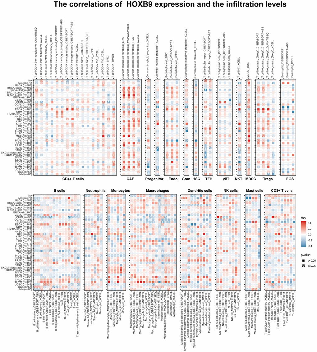 We further investigate the relationships between HOXB9 expression and immune cell infiltrations to demonstrate the links between HOXB9 and cancer immunity. We performed the Spearman correlation analysis using pan-cancer immune cell infiltration data. The infiltration levels in pan-cancer were shown in Figure 7. Our analysis demonstrated a positive correlation between HOXB9 expression and the infiltration levels of CAF, Endo, MDSC, macrophages, dendritic cells, and NK cells in most of the TCGA cancers. Moreover, in THYM, HOXB9 was positively related to the infiltration level of most immune cells such as CAF, B cells, monocytes, and macrophages. At the same time, it was negatively related to CD8+ T cells. Studies in recent years have shown that immune cell infiltration, such as CD4+T cells, CD8+ T cells, MDSC, CAF, etc., plays a crucial role in cancer immunotherapy [37, 38]. Hence, it is crucial not to overlook the significance of immune cells in cancer therapy. We used TISCH at the single-cell level to analyze the pan-cancer expression pattern of HOXB9. HOXB9 had relatively high expression in the myofibroblasts, endothelial, and fibroblasts, especially in myofibroblasts (Supplementary Figure 2). Lastly, the integration of ImmuneScore, EstimateScore, StromalScore, and neoantigens led to the observation that HOXB9 is linked to immune infiltration in certain types of cancer (Supplementary Figures 3–6). Overall, these findings strongly suggest that HOXB9 may have a significant impact on the cancers by interacting with immune cells.