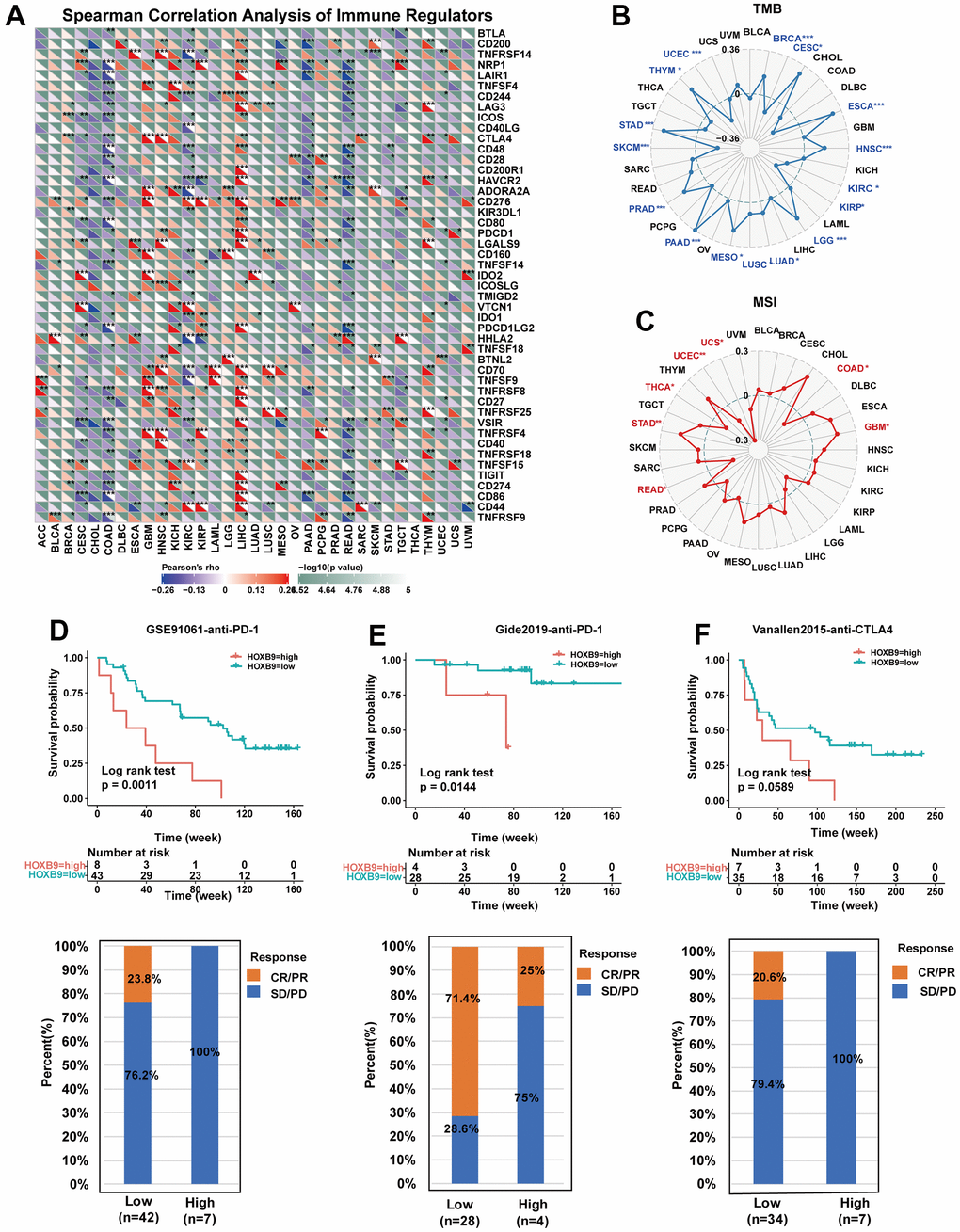 To evaluate the statistical correlations between HOXB9 and established immunotherapy biomarkers such as TMB, MSI, and immune checkpoint genes in pan-cancer, Spearman correlation analysis was performed. We obtained multiple cohorts of patients who had received immune checkpoint blockade therapy to validate whether HOXB9 could predict the response to this type of immunotherapy. HOXB9 expression and the immunotherapeutic effect were obtained from GSE91061 [34], Gide2019 [35], and the Vanallen2015 cohort [36]. The GSE91061 cohort refers to a collection of transcriptomic profiles from 51 melanoma patients who were treated with anti-PD1 (nivolumab). The purpose of this cohort is likely to study the gene expression patterns in response to this specific treatment in order to identify potential biomarkers or therapeutic targets for melanoma. The Gide2109 cohort includes 32 melanoma patients’ transcriptomic profiles receiving combined anti-PD-1 and anti-CTLA-4 immunotherapy. The Vaballen2015 cohort contains 42 melanoma patients treated with anti-CTLA-4 (atezolizumab).