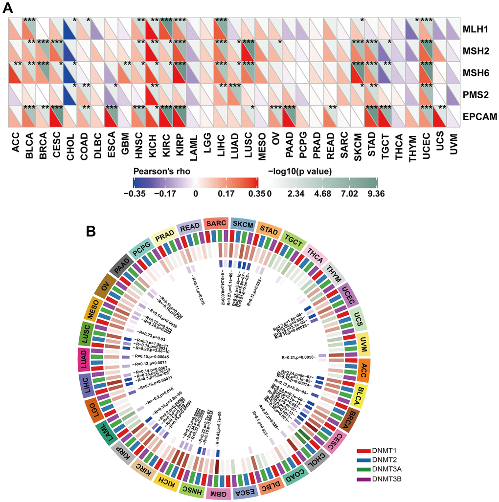 We then investigated the association between HOXB9 gene expression and the mechanisms underlying tumorigenesis, specifically focusing on DNA methylation of genes essential for tumorigenesis and mismatch repair deficiency. Defects in MMR can result in the accumulation of somatic mutations that cannot be repaired, which can contribute to tumorigenesis [43]. We found the five MMR genes were associated with HOXB9 and reached a significant correlation in some cancers (Figure 9A), which may suggest that MMR may have a potential role in regulating tumorigenesis by reducing the rate of DNA replication errors. DNA methylation is an epigenetic mechanism that can significantly decrease the rate of DNA replication errors by regulating gene expression through chromatin structure and DNA conformation modifications [44], and how DNA interacts with proteins [45, 46]. Aberrant DNA methylation patterns played a potential role for this epigenetic modification in tumorigenesis [47]. Therefore, we further evaluated the relationship between HOXB9 and DNA methyltransferases (DNMT1, DNMT2, DNMT3A, and DNMT3B). Interestingly, as for results shown in Figure 9B, expression of HOXB9 was highly correlated with these methyltransferases in a variety of cancers, specifically in SKCM, UCEC, BLCA, BRCA, CESC, GBM, HNSC, KIRP, LIHC, and LUSC. Taken together, this study revealed that HOXB9 might regulate tumorigenesis by affecting DNA repairment and DNA methylation across cancers.