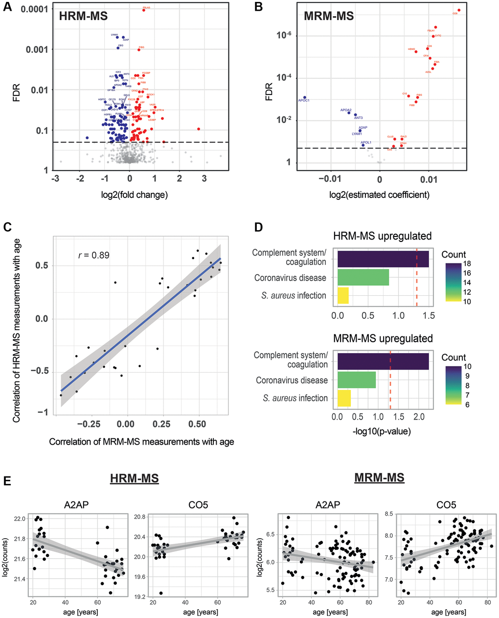 Having identified 145 age-associated proteins, we then selected a representative subset of 31 proteins to be measured in our entire cohort of 103 individuals (Supplementary Table 2) using targeted Multiple Reaction Monitoring mass spectrometry (MRM-MS). As expected from our HRM-MS analysis, most of these proteins were also significantly associated with age (21 out of 31; FDR < 0.2) when measured using this different methodology and in the full cohort (Figure 2B, 2E, Supplementary Figure 3, Supplementary Table 2). The consistency between the untargeted and targeted mass spectrometry methods was further confirmed by observing a high correlation of all common measurements (r = 0.83, Supplementary Figure 2A) and of the proteins’ Pearson correlation with age (r = 0.89, Figure 2C). As external validation, we compared the beta coefficients from our study with those of another study that quantified age-dependent changes in plasma proteins [18] and found a Pearson correlation coefficient of 0.85 (see Supplementary Figure 2B). The 15 significantly upregulated proteins in this assay showed similar pathway enrichment as in HRM-MS, with the complement system being significantly enriched (Figure 2D, lower panel). Only six proteins were downregulated, and no functional enrichment term reached significance (data not shown). However, three of these six proteins were apolipoproteins (APOC1, APOA1 and APOL1), suggesting a down-regulation of this type of protein with age. Taken together, we established a set of 21 proteins that show age-dependent abundance changes by two independent MS methods, and we quantified these proteins by MRM-MS across the entire cohort.