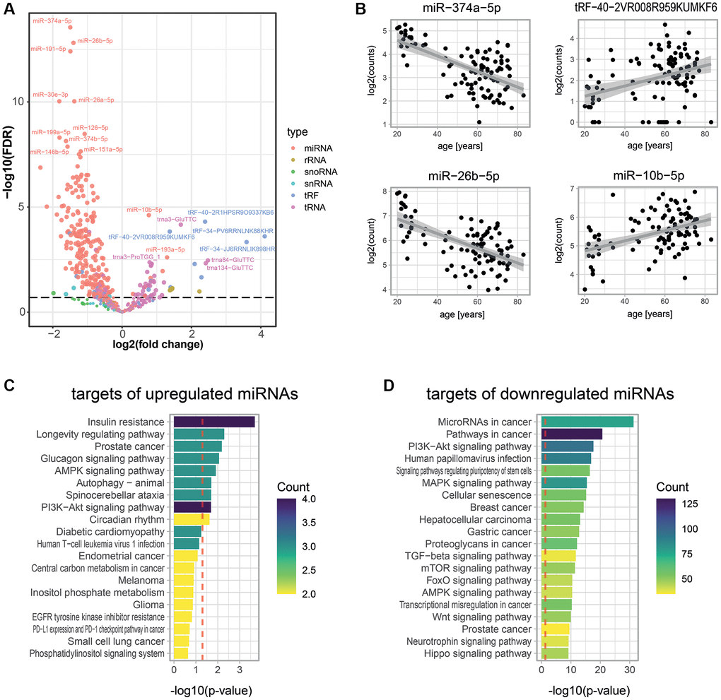 Additionally, we measured small RNAs using the Small-seq methodology and identified 315 small RNAs that changed in abundance with age in human blood plasma (Figure 3, Supplementary Table 3). miRNAs were clearly the most prominent age-associated class of small RNAs, showing a strong down-regulation with age. The age-related decrease in miRNAs is remarkable since this small RNA class has recognized roles in intercellular communication [62, 63]. The loss of these circulating miRNAs may, therefore, contribute to the deregulation of gene expression in various tissues with age [64]. Studies in multiple species have reported a downregulation of Dicer expression with age [65, 66], which may contribute to this phenomenon. Furthermore, the identified age-associated miRNAs themselves are interesting: First, the miRNAs with the highest age-association were actually pairs of closely related miRNAs (i.e., mir-26a-5p and mir-26b-5p as well as mir-374a-5p and mir-374b-5p). While the miRNAs of each pair likely have similar physiological roles, they are transcribed from different chromosomal loci and hence experience synchronous regulation, further strengthening the notion that their decrease with age is no coincidence but the outcome of a concerted regulatory event. Second, the predicted targets of the miRNAs declining with age were enriched for functions promoting growth, cancer, and senescence. Thus, the decrease in these circulating miRNAs could contribute to the increased occurrence of cancers in the elderly by upregulating oncogenes. Third, the very few miRNAs that were upregulated with age had predicted targets involved in insulin resistance and longevity regulation and thus may be important players regulating age-related morbidities or even aging directly [c67].