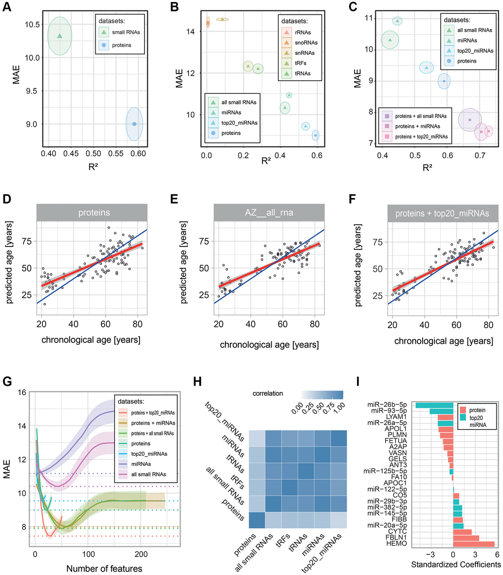 Next, given that our models were trained on only 21 age-associated proteins, we wanted to exclude the possibility that the improved performance of models combining proteomics and small RNA data was simply due to this limited number of variables. We tested this by using the same cross-validation strategy as above, but this time using the untargeted (HRM-MS) instead of the targeted (MRM-MS) proteomics results to build our models. The results showed a higher mean performance of models combining proteomic and miRNA data compared to either data type alone (Supplementary Figure 6), suggesting that proteomic and miRNA data are complementary, even when the number of age-associated proteins is not limiting. Taken together, our observations suggest that models built from proteins or from small RNAs capture different aspects of aging, and therefore, age predictions benefit from their combination.