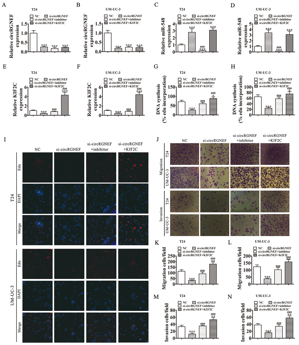 Downregulation of miR-548 or overexpression of KIF2C restored proliferation, migration, and invasion after circRGNEF silencing. (AF) RT-qPCR shows the expression of circRGNEF (A, B), miR-548 (C, D), and KIF2C (E, F) in T24 and UM-UC-3 cells following transfection or treatment with NC, si-circRGNEF, miR-548 inhibitor, KIF2C overexpression vector (KIF2C) single or combined. Data are presented as the mean ± SD. ***P < 0.001 vs. NC. ###P < 0.001 vs. si-circRGNEF. (GI) Cell proliferation was analyzed by EdU assays. Data are presented as the mean ± SD. ***P < 0.001 vs. NC. ###P < 0.001 vs. si-circRGNEF. (JN) Cell migration and invasion were assessed in T24 and UM-UC-3 cells using Transwell assays. Data are presented as the mean ± SD. ***P < 0.001 vs. NC. ###P < 0.001 vs. si-circRGNEF.