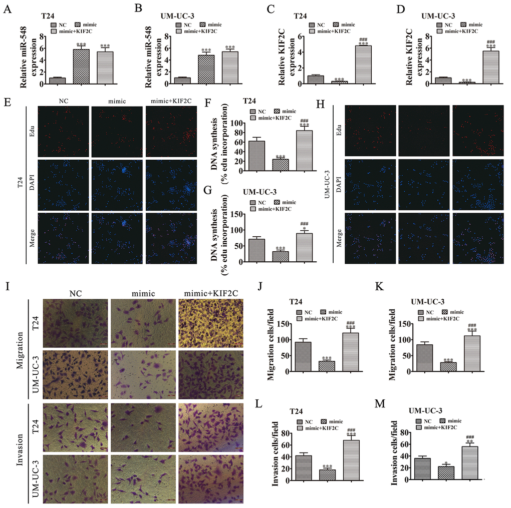 KIF2C overexpression reversed miR-548-induced cell migration, invasion, and growth inhibition in vitro. (AD) T24 and UM-UC-3 cells were transfected with miR-548 mimics with or without the KIF2C overexpression vector. RT-qPCR shows the expression of miR-548 (A, B) and KIF2C (C, D) in T24 and UM-UC-3 cells. Data are denoted by the mean ± SD. ***P < 0.001 vs. NC. ###P < 0.001 vs. mimic.
