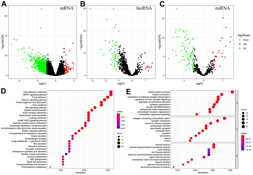 Referring to the revised Bethesda guidelines for colorectal cancer, samples were divided into two groups: samples displaying instability at two or more of the five recommended loci (BAT-25, BAT-26, NR-21, NR-24, NR-27) were interpreted as MSIH (19.2%), while tumors with only one or no locus altered were identified as MSIL/S (80.8%). The “gdcDEAnalysis” function in the “GDCRNATools” package was applied to screen for differentially expressed genes between the MSIH and MSIL/S groups [40]. The screening conditions were set at |log2 (fold change) |>1 and FDR<0.05 for mRNA and lncRNA, and |log2 (fold change) |>0.5 and FDR<0.05 for miRNA. A volcano plot was used to display the DEmRNAs, DEmiRNAs, and DElncRNAs.