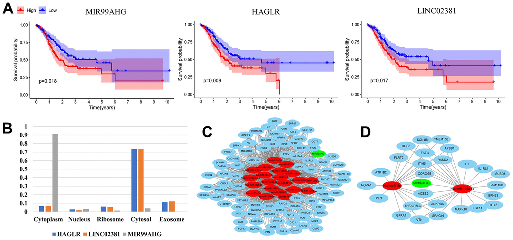 The constructed ceRNA network from the previous step comprised of 2729 lncRNA-mRNA pairs and 895 nodes (808 mRNAs, 44miRNAs and 43 lncRNAs). Survival analysis was conducted on the 43 lncRNAs to identify the hub lncRNAs with prognostic significance. According to literature, lncRNAs exert their function based on their cellular position and sponging lncRNAs are mainly located in the cytoplasm [43]. Therefore, location prediction was conducted following survival analysis. In addition, nucleotide sequences for the lncRNAs of interest were downloaded from the NCBI nucleotide website (https://www.ncbi.nlm.nih.gov/nuccore/), then uploaded to the lncLocator database (http://www.csbio.sjtu.edu.cn/bioinf/lncLocator/) [44] to predict the possible positions of the lncRNAs. The result from this database revealed 5 possible locations and the corresponding possibility. Notably, MIR99AHG was targeted as the hub lncRNA, as it was located in the cytoplasm and was a significant risk factor for the overall survival of GC patients. Finally, we screened for the MIR99AHG-related mRNAs and miRNAs, then performed Unicox analysis on the related genes. Only genes with prognostic significance were retained and the final hub ceRNA regulatory network was constructed.