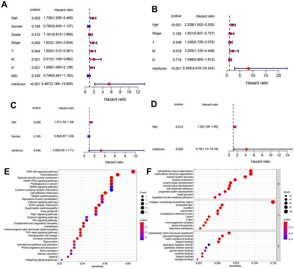Based on the mRNAs in the final hub ceRNA regulatory network, the “glmnet” package was used to construct the prognosis prediction model. Thereafter, patients were stratified into the high- and low-risk groups based on the median value of the predicted risk score. In addition, survival differences between these 2 groups were analyzed using the Kaplan-Meier curve method. The efficiency of the model was tested through the ROC curve which was plotted using the “ROCR” package. Moreover, PCA analysis was conducted to test whether the predicted risk score could successfully stratify patients based on risk. MultiCox analysis was also conducted to show whether the predicted risk score was an independent prognostic factor in GC patients. To test the generalization ability of the established model, all the above analyses were conducted in the GEO datasets which have been detailed in the “Data Acquisition and Preparation” section. Furthermore, correlation analysis was conducted to check for consistencies between the risk score and existing clinical characteristics. Finally, differentially expressed genes between the 2 risk groups were screened using FDR≤0.05 and | logFCfilter | ≥1, and GO and KEGG enrichment analyses were conducted based on these differentially expressed genes.