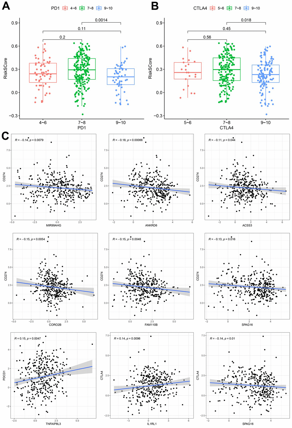 315 IPS scores for TCGA-STAD patients were downloaded from the TCIA database and integrated into patient data. The IPS score can be classified into 2 types, where one type represents the possibility of response to the PD1/PDL1/PDL2 blocker, while the other represents the possibility of response to the CTLA4 blocker. Additionally, patients can be divided into 3 groups based on the IPS score: 4-6, 7-8 and 9-10. With respect to the PD1/PDL1/PDL2 blocker, these 3 groups of patients accounted for 18%, 66% and 16%, respectively, while for the CTLA4 blocker, these 3 categories of patients accounted for 7%, 57% and 36%, respectively. Differences in risk scores among the 3 groups were compared and the results are shown in Figure 6A, 6B. In both therapies, the risk score of the 9-10 group was significantly lower than that of the 7-8 category, indicating that a lower risk score was associated with a better ICI response. These results demonstrated that our calculated signature could not only predict OS but also forecast the ICI response to a certain degree. To further explore this interesting observation, we assessed the correlation between the expression of the hub nodes (MIR99AHG and 7 genes used in the model) and 3 immune checkpoint genes (PD-L1(CD274), PD1(PDCD1), CTLA4). The findings showed that MIR99AHG, ANKRD6, ACSS3, CORO2B, FAM110B, and SPAG16 were negatively associated with PD-L1 (Figure 6C). Additionally, TNFAIP8L3 was positively correlated with PD1, while IL1RL1 was positively correlated with CTLA4. However, SPAG16 was negatively correlated with CTLA4.
